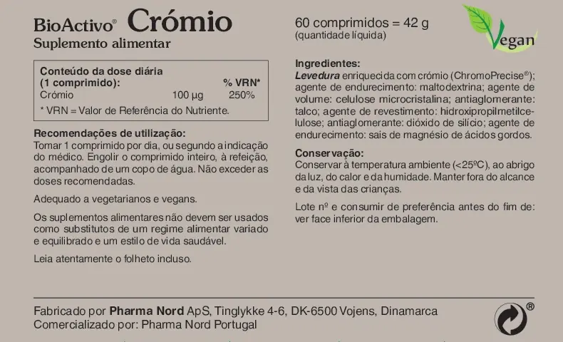 Cada comprimido de BioActivo Crómio contém100 microgramas de crómio elementar. O crómio utilizado em BioActivo Crómio está ligado organicamente, ou seja, está ligado a uma levedura e a aminoácidos (levedura de crómio). Tem uma elevada absorção no organismo, 10 vezes superior a outras fontes aprovadas de crómio. BioActivo Crómio é produzido com uma fonte de crómio patenteada designada de ChromoPrecise®, que é uma levedura de crómio desenvolvida especificamente para fornecer uma excelente biodisponibilidade. Esta fonte de crómio específica é fabricada de acordo com as mais rígidas normas de controlo (as normas BPF que são utilizadas pela indústria farmacêutica), para assegurar a eficácia e segurança das preparações, com base em documentação exaustiva.